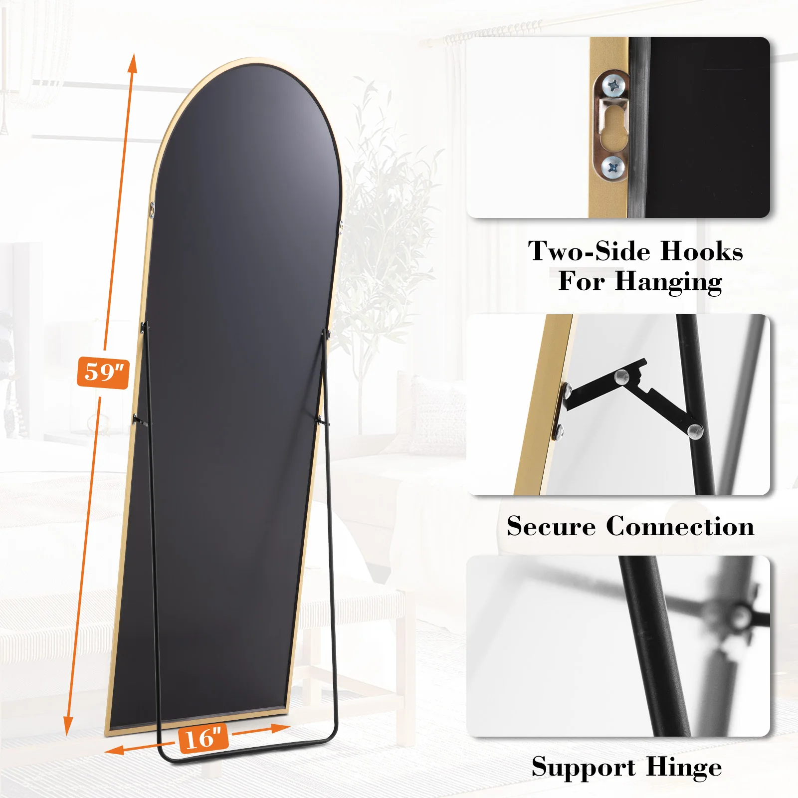ALL-MATCH: No Assembly Required. The floor length mirror can stand anywhere with the standing holder. You also can lean it against a wall, or you can hang it vertically on the wall for space-saving. It is suitable for a bedroom, living room, cloakroom, home gym, corridor, bathroom.